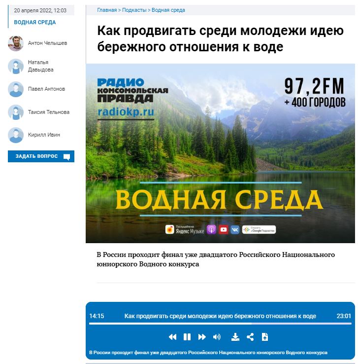 На радио «Комсомольская правда» вышла передача «Водная среда», посвященная финалу Российского национального юниорского водного конкурса-2022. Участниками передачи стали руководитель Водного конкурса Н.Г. Давыдова и финалисты: Кирилл Ивин из Республики Саха Якутия, победитель номинации "Арктическая лента", и Таисия Тельнова из Санкт-Петербурга, победитель номинации Председателя Номинационного комитета.