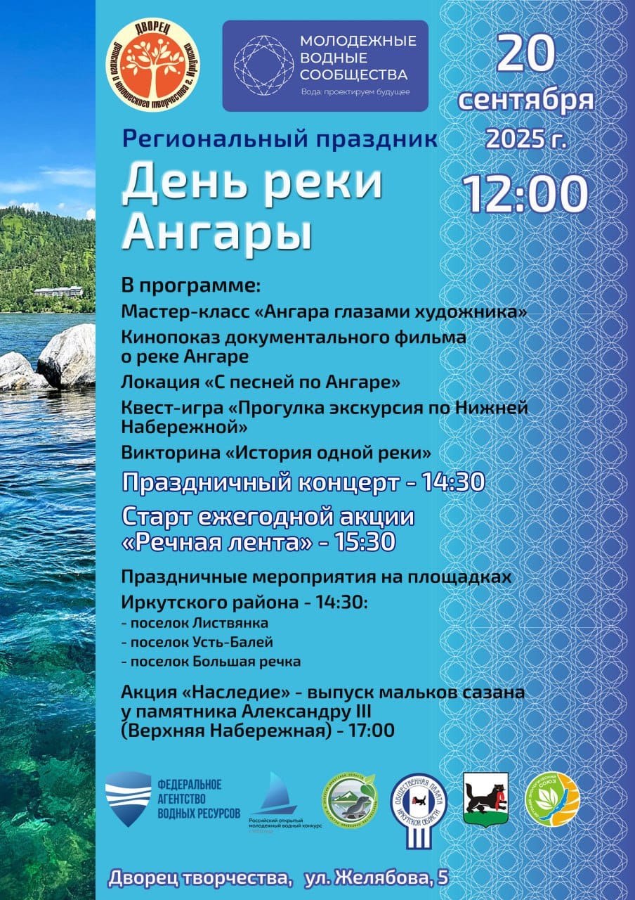 Молодежное водное сообщество Иркутской области в сотрудничестве с партнерами: Законодательным собранием, Общественной палатой, Министерством природных ресурсов и экологии, Детским экологическим союзом и др. готовит для жителей и гостей региона интересную и насыщенную программу мероприятий к Дню Ангары, который в этом году впервые отпразднуют в Иркутской области 20 сентября.