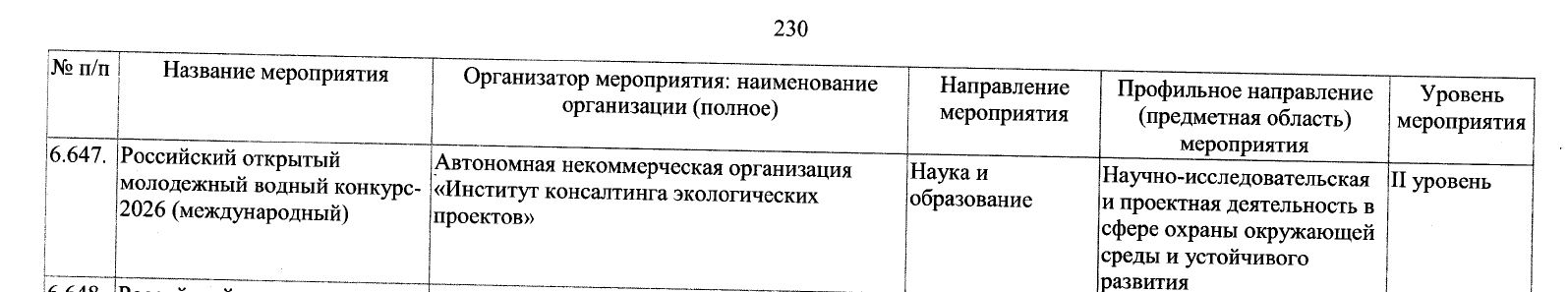 Российский открытый молодежный водный конкурс включен в «Перечень олимпиад и иных интеллектуальных и (или) творческих конкурсов, мероприятий, направленных на развитие интеллектуальных и творческих способностей, способностей к занятиям физической культурой и спортом, интереса к научной (научно-исследовательской), инженерно-технической, изобретательской, творческой, физкультурно-спортивной деятельности, а также на пропаганду научных знаний, творческих и спортивных достижений, на 2025/26 учебный год», утвержденный Приказом Министерства просвещения Российской Федерации от 31.08.2025г. № 639 в соответствии с Постановлением Правительства от 19.10.2023 г. № 1738 «Об утверждении Правил выявления детей и молодежи, проявивших выдающиеся способности, и сопровождения их дальнейшего развития».