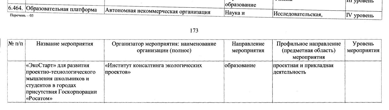 Образовательная платформа «ЭкоСтарт» для развития проектно-технологического мышления школьников и студентов в городах присутствия Госкорпорации «Росатом» включена в «Перечень олимпиад и иных интеллектуальных и (или) творческих конкурсов, мероприятий, направленных на развитие интеллектуальных и творческих способностей, способностей к занятиям физической культурой и спортом, интереса к научной (научно-исследовательской), инженерно-технической, изобретательской, творческой, физкультурно-спортивной деятельности, а также на пропаганду научных знаний, творческих и спортивных достижений, на 2025/26 учебный год», утвержденный Приказом Министерства просвещения Российской Федерации от 31.08.2025г. № 639 в соответствии с Постановлением Правительства от 19.10.2023 г. № 1738 «Об утверждении Правил выявления детей и молодежи, проявивших выдающиеся способности, и сопровождения их дальнейшего развития».
